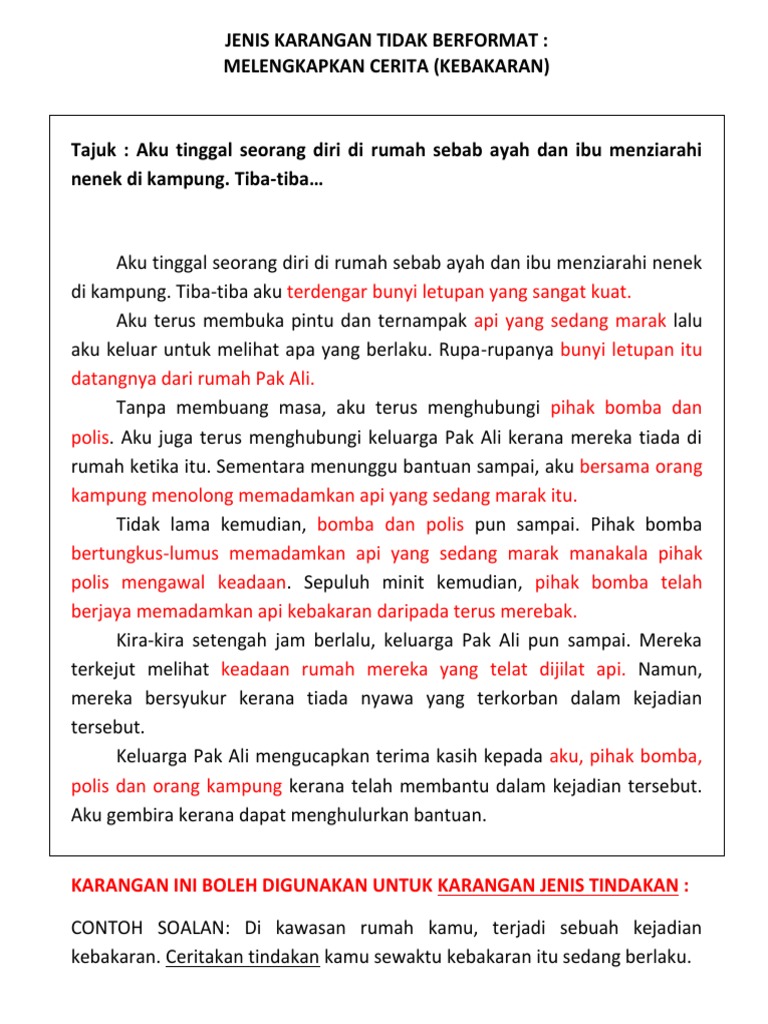 Tip Adalah lebih baik jika adik semua menggariskan perkataan-perkataan yang menjadi kata kunci dalam soalan itu. Pelbagai jenis dan format karangan telah disediakan. Contoh soalan cereka Suatu hari ketika kamu tinggal sendirian di rumah.